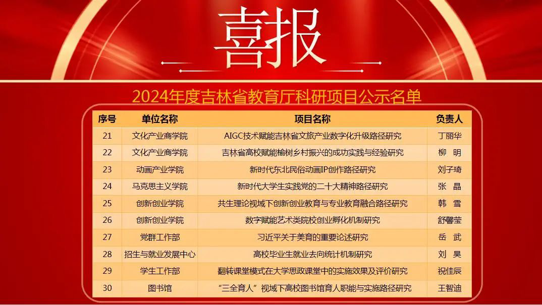 近日,吉林省教育厅、吉林省财政厅下发通知,公布了2024年度吉林省教育厅科学研究项目立项名单,我校获批立项30项,项目涵盖艺术学理论、戏剧与影视、美术与书法、设计学、马克思主义理论、中国语言文学等多个学科。