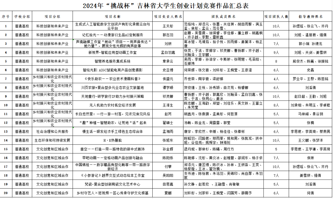 根据校赛决赛专家评审结果,科技创新和未来产业组6个项目、乡村振兴和农业农村现代化组6个项目、社会治理和公共服务组1个项目、生态环保和可持续发展组1个项目、文化创意和区域合作组6个项目,共计20个项目入围省赛。
