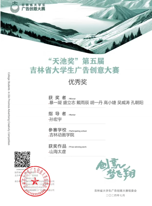 通过努力,“神话志”项目团队在第五届“天池奖”吉林省大学生广告创意大赛中荣获优秀奖;在英国国际设计大赛中分别斩获银奖和铜奖;团队成员暴一凝、盛立志、刘宇含共同创作的《小红帽与网络狼》故事,在北京市国家网络安全宣传周期间展出;2024年,团队策划并举办了“绿色校园——文化市集”活动,推动了创意方案的落地实施。