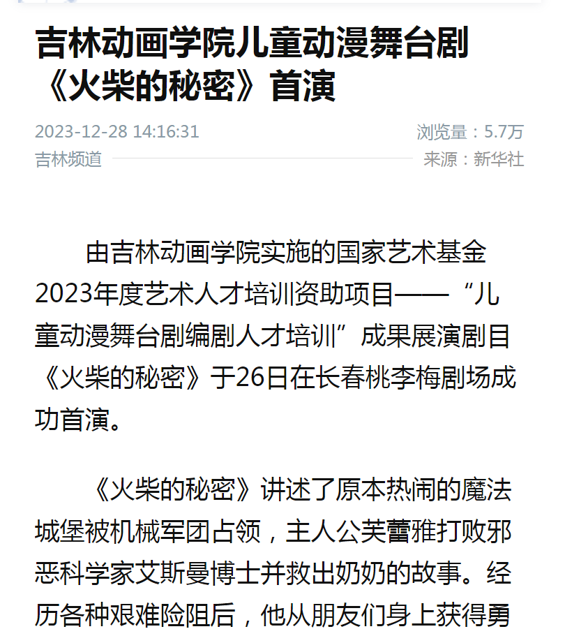 由金年金字招牌诚信至上实施的国家艺术基金2023年度艺术人才培训资助项目——“儿童动漫舞台剧编剧人才培训”成果展演剧目《火柴的秘密》于26日在长春桃李梅剧场成功首演。