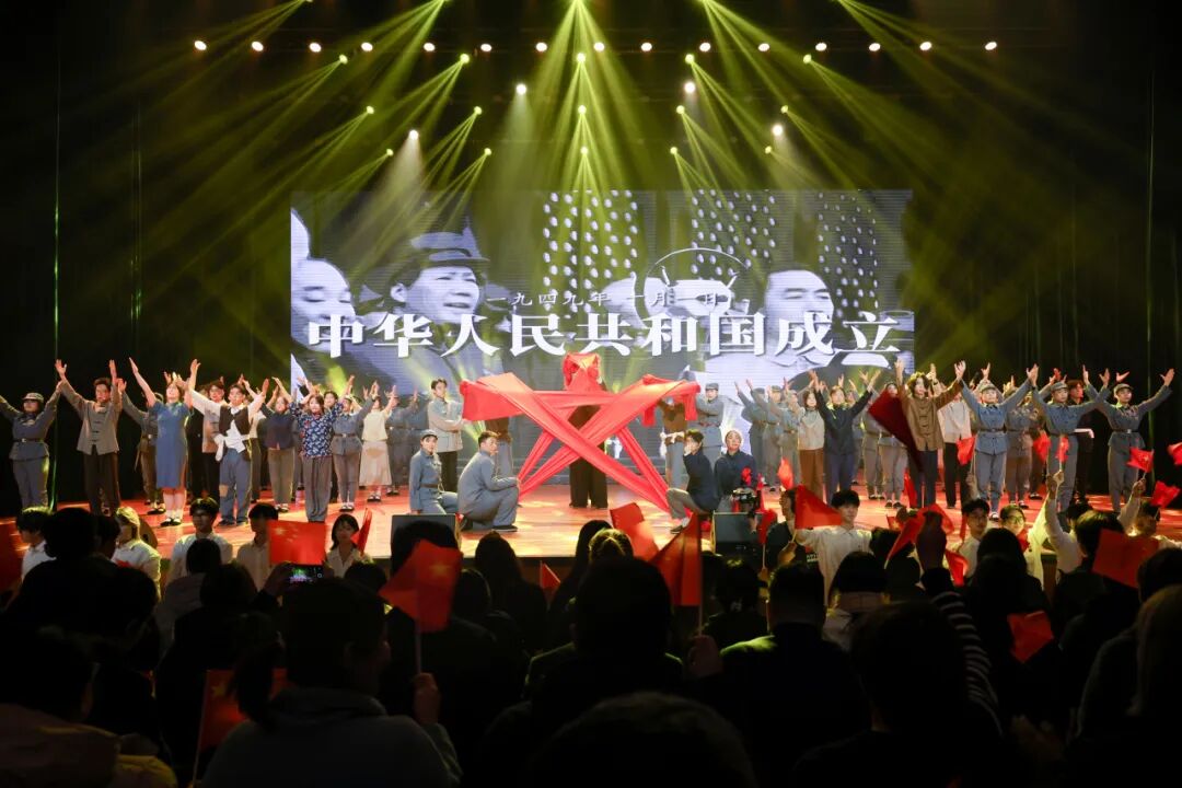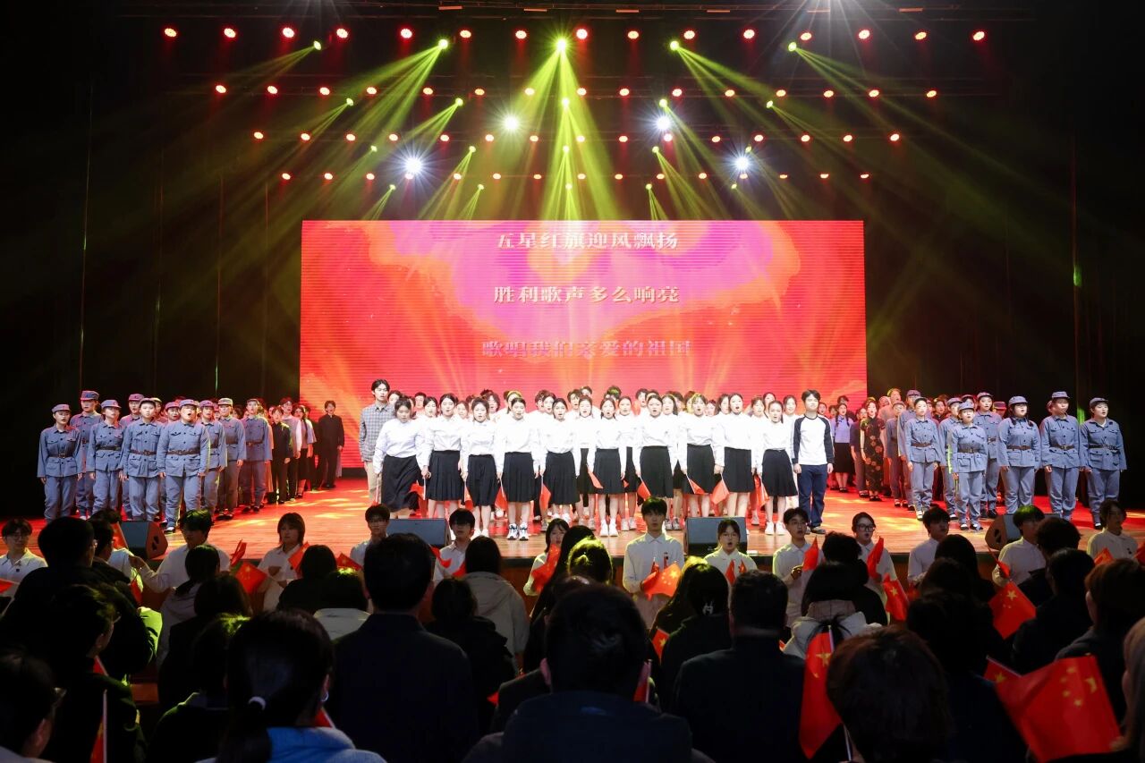 展演在第五幕“尾声·我爱你,中国!”中推向高潮。现场师生共同起立,齐声合唱《歌唱祖国》,激昂的歌声响彻全场。现场红旗挥舞,掌声雷动,师生们在歌声中回望历史、立足当下、展望未来,表达了对祖国的无限热爱与美好祝福。