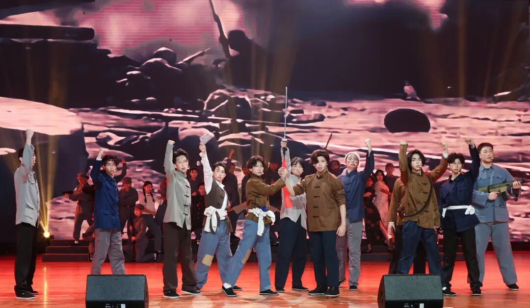 学校大学生艺声歌舞团以红色旋律为纽带,全景再现全民抗战的壮阔史诗。从《松花江上》的悲愤呐喊到《保卫黄河》的雄浑激昂,从《游击队歌》的轻快坚毅到《地道战》的机智果敢,再到《没有共产党就没有新中国》的深情赞颂,一曲曲经典旋律串联起中华民族不屈不挠的抗战史诗,展现了中国人民在危难中凝聚的磅礴力量,引发全场起立,共同挥舞起五星红旗,让现场观众深切感受到了红色歌曲的精神感染力。