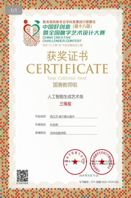 2022-2023年度,在第三届游艺杯AI游戏场景角色概念赛中荣获省级一等、二等、三等奖;在第三届清华艺科工坊活动中获得了第三名和第七名的佳绩;在全国高校数字艺术设计大赛获省级奖项。