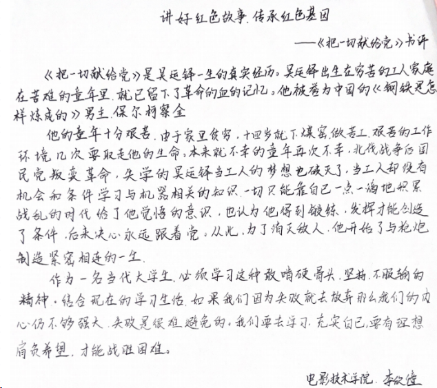 “风劲帆满图新志、砥砺奋进正当时。”为让青年学子进一步传承红色文化,品红色经典,担负时代使命,学校举办“喜迎二十大 读红色经典”为主题的书评活动,同学们积极参与,充分展现了我校学子传承红色基因,弘扬爱国主义精神,坚定共产主义信念的精神风貌。