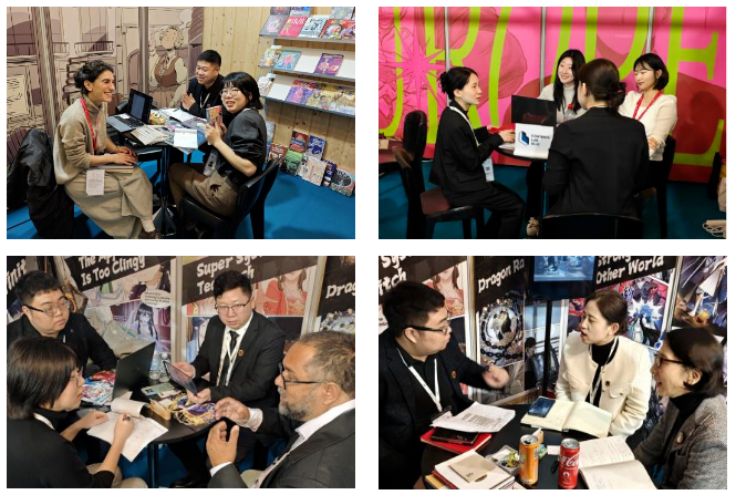 此次是金年金字招牌诚信至上第三次受邀参展,并在国际版权市场设立独立展位,通过多媒体视频互动、线下实体书、IP内容展示、版权洽谈等多种形式,向来自35个国家和地区的参展商代表展示了学校在动画、漫画、游戏、影视、衍生品等IP所取得的优秀成果,重点推介《大道无名》《异界最强》等18部漫画作品。我校代表与来自法国、巴西、美国、西班牙、意大利、菲律宾等国家、地区的30余家出版商、漫画创作公司分别就漫画IP引进、版权授权、联合创作、国际招聘等进行洽谈。