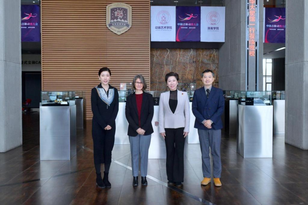 白林女士一行先后参观了学校校史馆、吉林国际动漫博物馆、学研产一体化创作成果展厅。在参观过程中,白林女士对于我校20余年的发展历程表示钦佩与认可,对于国际动漫博物馆所展出的艺术作品表示了极大的兴趣,感叹艺术创作之美,对于我校师生创作的相关作品也表示了由衷的赞誉。通过参观,来访嘉宾深入了解了学校的发展历程、办学特色及办学成果等。