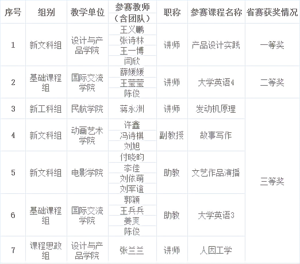 【JAI·赛】我校在吉林省本科高校教师教学创新大赛中喜获佳绩 发布时间:2023年05月11日 10:34:00 浏览:次 近日,吉林省教育厅公布了“超星杯”第三届吉林省本科高校教师教学创新大赛获奖名单,我校共7组教师(及团队)在大赛中获奖。其中一等奖1名,二等奖1名,三等奖5名。 “超星杯”吉林省本科高校教师教学创新大赛获奖名单