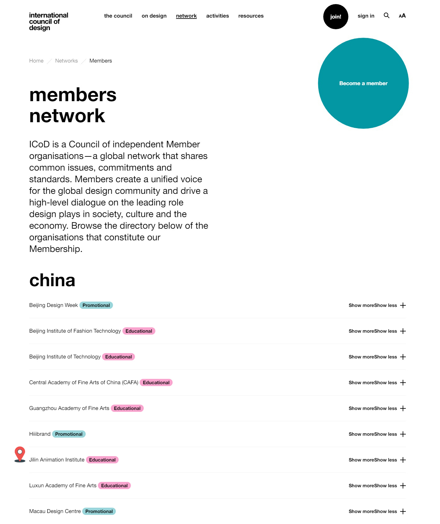 国际设计联合会( International Council of Design ,简称ico-D )被誉为“ 设计联合国” ,在世界范围内有200 多家高校和设计组织等会员单位,是世界最具影响力的国际设计组织。其组织目的是推广优质设计,秉持设计意义,倡导创意领导力。澳大利亚皇家墨尔本理工大学、加拿大艾米丽卡尔大学、日本武藏野美术大学、新加坡南洋理工大学、伦敦艺术大学中央圣马丁学院等国际著名高校都是该组织会员单位。