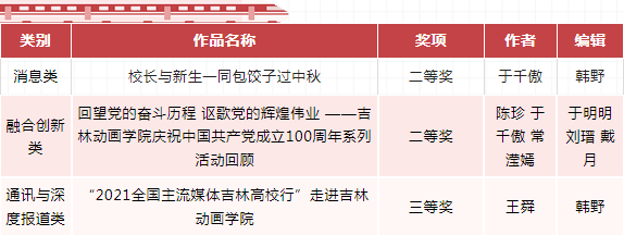 本次评选由吉林省高校新闻工作者协会主办,共分为消息、通讯与深度报道、融合创新作品以及短视频作品9个类别。经过评选,学校企划部报送的作品喜获消息类二等奖1项,融合创新类二等奖1项,通讯与深度报道类三等奖1项。