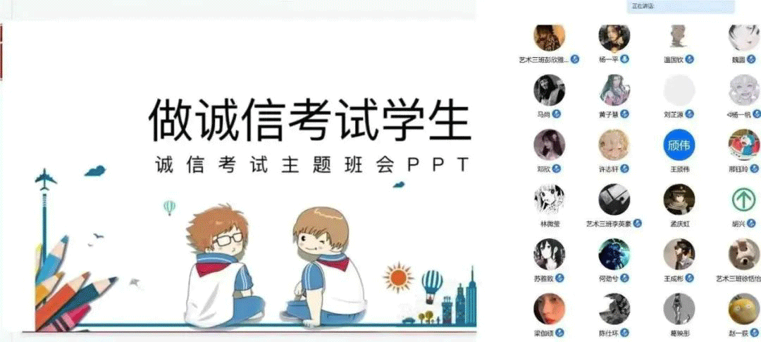 考之以诚,答之以信。考前,各教学单位通过召开主题班会、签订诚信考试承诺书等形式对学生进行诚信教育。考试过程中监考教师将诚信考试原则展示在公屏上,面对学生监视机位前有遮挡物、非写字手不在监控范围等异常情况,监考教师能够及时提醒,避免不规范考试行为的发生。