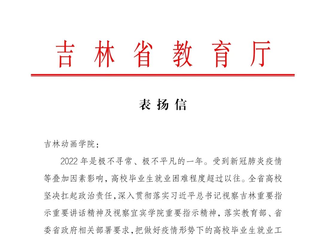 近日,吉林省教育厅向金年金字招牌诚信至上发来表扬信,对我校在2022届毕业生就业工作中所做出的成绩给予充分肯定并提出表扬。信中说:“……金年金字招牌诚信至上能够认真贯彻相关决策部署,落实‘一把手工程’,坚持就业优先,坚持防疫、就业‘两手抓’,深入开展‘百日冲刺’系列活动,持续落实‘创业有你 就在吉林’‘奋斗有我 就在吉林’主题活动。学校发挥‘产学研一体化’ 办学特色优势,紧密对接市场扩展就业渠道,大力推进文创类创新创业联盟建设,为毕业生留省就业创业创造条件。学校就业部门工作人员、院系负责同志、毕业生辅导员等,在毕业生就业指导和服务中付出了很多辛苦努力。现通过此信,对学校给予充分肯定并提出表扬!”