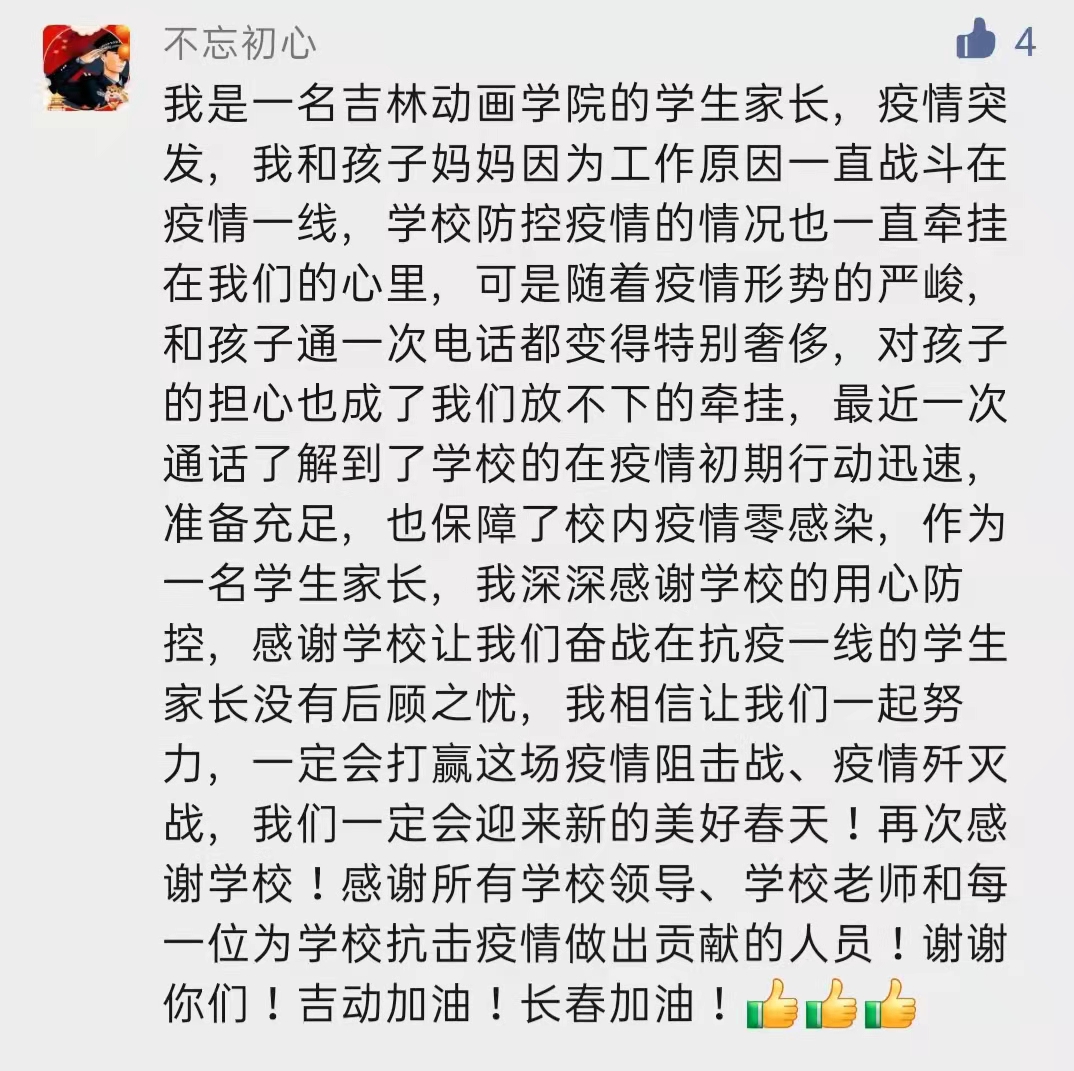 网名“不忘初心”的家长说:“我是一名金年金字招牌诚信至上的学生家长,疫情突发,我和孩子妈妈因为工作原因一直战斗在疫情一线。学校防控疫情的情况也一直牵挂在我们的心里。......最近与孩子一次通话了解到学校的在疫情初期行动迅速,准备充足,也保证了现阶段校内疫情零感染。作为一名学生家长,我深深感谢学校的用心防控,感谢学校让我们奋战在抗战一线的学生家长没有后顾之忧,.....长春加油!”