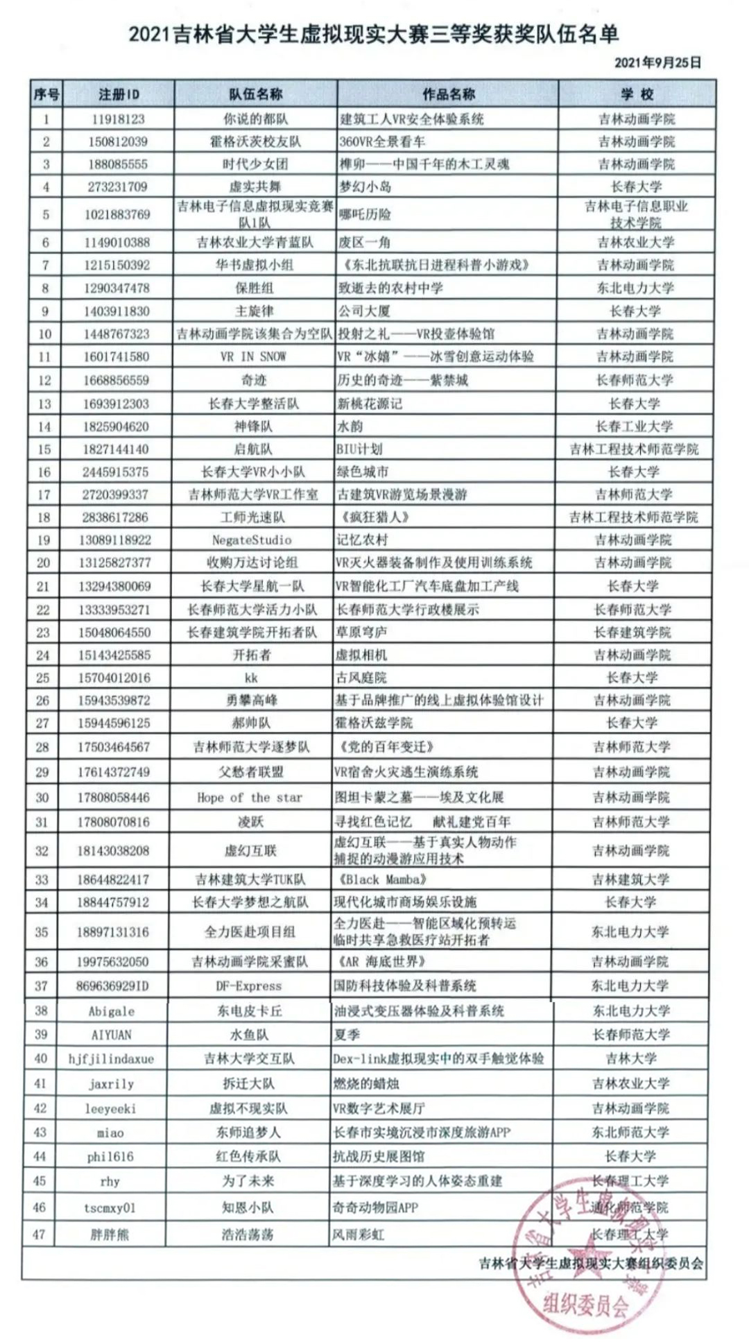获奖队伍名单