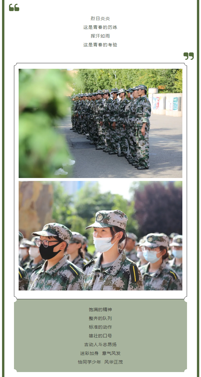 【JAI·军】军训日记 | 难忘的迷彩时光 发布时间:2021年09月02日 15:34:00 浏览:次 >>>> 本期编辑 | 戴月 图片来源 | 张术 大学生融媒体中心 李娜娜 穆奕辰 刘璇 权艺婷 徐可可 李淑瑜 付彦德