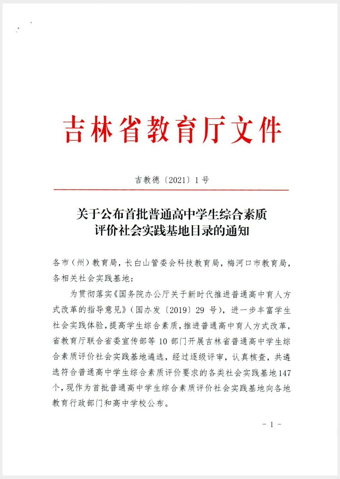 吉林省普通高中学生综合素质评价社会实践基地是根据《国务院办公厅关于新时代推进普通高中育人方式改革的指导意见》(国办发〔2019〕29 号),为进一步丰富学生社会实践体验,提高学生综合素质,推进普通高中育人方式改革,由吉林省教育厅联合省委宣传部、吉林省市场监督管理厅等10部委开展遴选。