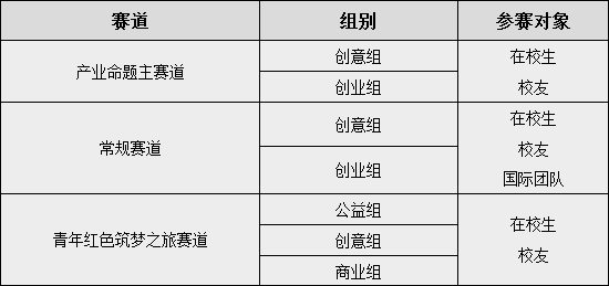 分别设置产业命题主赛道、常规赛道、青年红色筑梦之旅赛道。分创意组、创业组、公益组、商业组进行评审。
