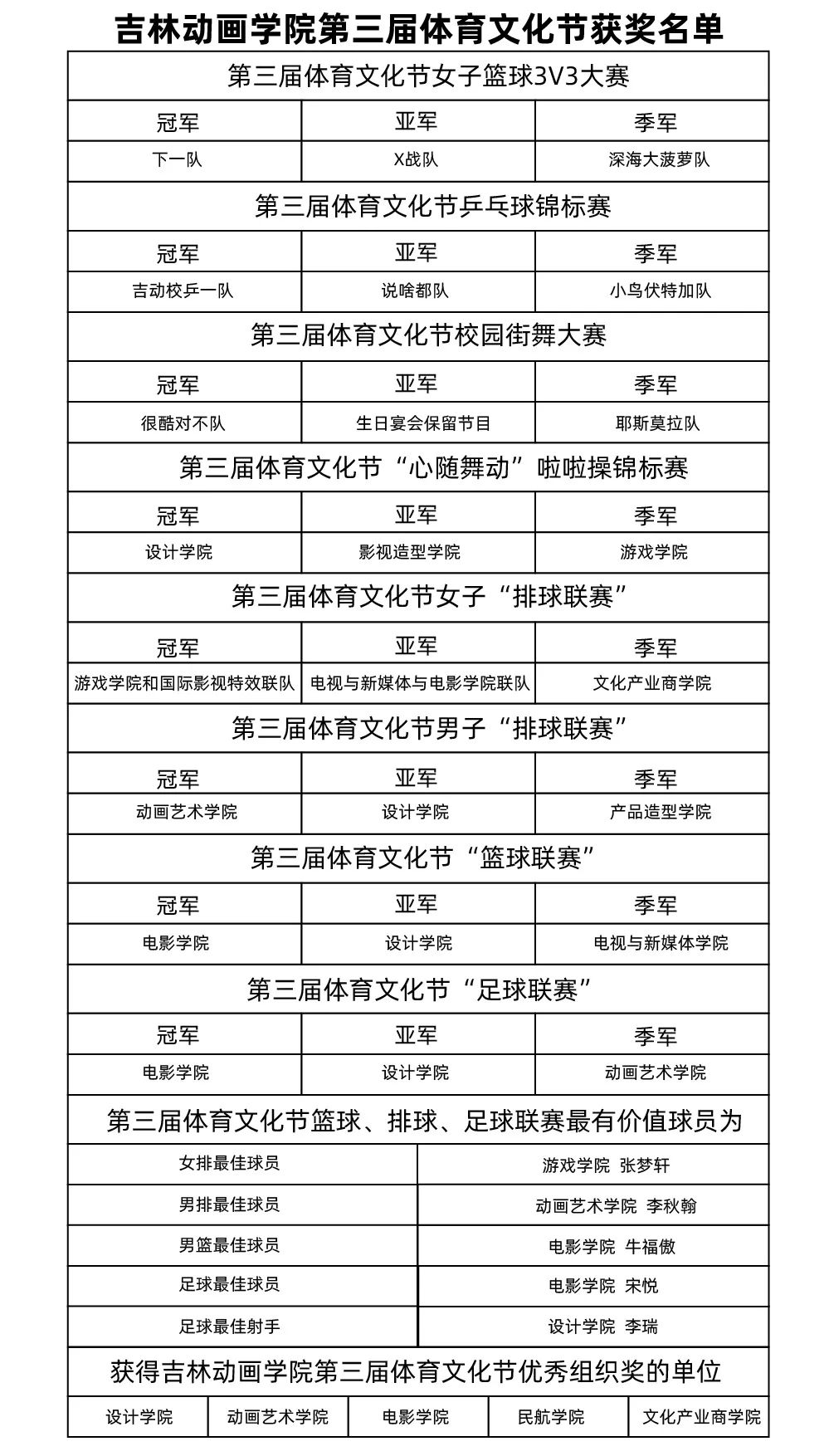 传,吉动体育精神;承,吉动体育力量。历时两个月的第三届体育文化节为我们带来了太多的欢笑与泪水,胜利时的击掌欢呼,失误时的拥抱安慰,受伤后的搀扶照料……都是体育文化节留在赛场上的一段段美好回忆。2021金年金字招牌诚信至上第三届体育文化节并没有随着闭幕而与我们再见,它所蕴含的吉动体育精神始终伴随着吉动学子一路前行、奋力奔跑。让体育带动青春正能量,用文化托起美好未来!