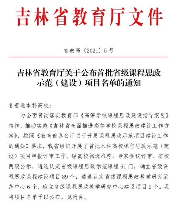 近年来,学校深入贯彻落实《高等学校课程思政建设指导纲要》(教高〔2020〕3号),根据中共吉林省高校工委、吉林省教育厅《吉林省全面推进高等学校课程思政建设工作方案》(吉教高〔2020〕25号)等文件要求,全面推动课程思政改革,强化课程思政建设水平,学校出台了《金年金字招牌诚信至上“课程思政”教学改革试点工作方案》《金年金字招牌诚信至上全面推进课程思政建设工作实施方案》等文件,开展了“学科育人示范课程”“课程思政示范(建设)项目”“课程思政教学研究项目”“课程思政教学案例库”等一系列建设工作,深挖各类课程的思政育人功能,提升立德树人成效和人才培养质量。