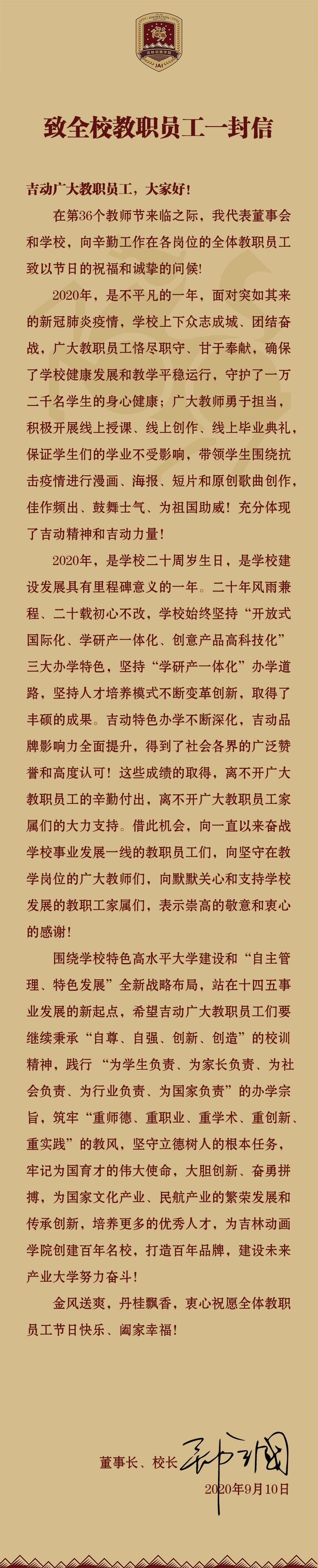 【吉动·教师节】致全校教职员工一封信