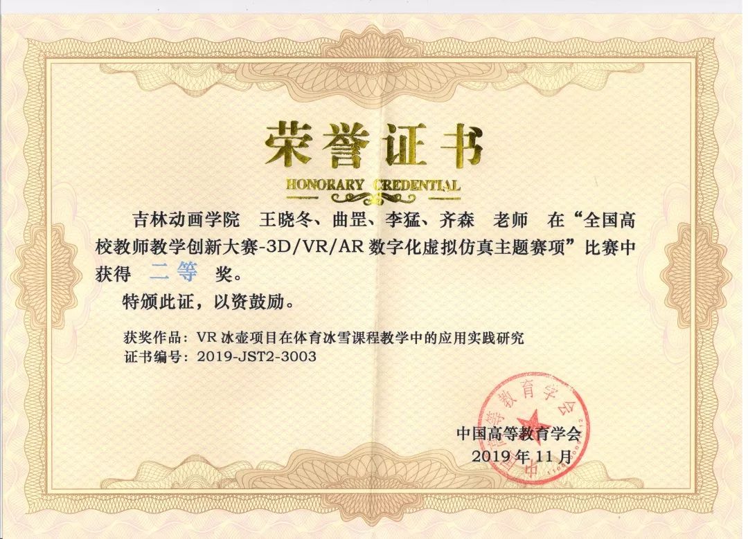 我校游戏学院教师王晓冬、李猛、齐森和体育俱乐部教师曲罡组成的《VR冰壶项目在体育冰雪课程教学中的应用实践研究》项目参赛团队,凭借对参赛项目中VR数字化虚拟仿真技术的熟练应用、精彩的现场展示和热情激昂的答辩,从“面向教育教学的3D/VR/AR创新应用”赛道75个入围作品中脱颖而出,最终在全国总决赛荣获了二等奖的优异成绩。这既表现了我校教师发挥专业技术优势,结合学科教学特点在专业交叉融合上利用现代技术进行教学方法手段改革的创举,又展现了教师扎实的基础知识、良好的创新意识及实践操作和教学应用能力。