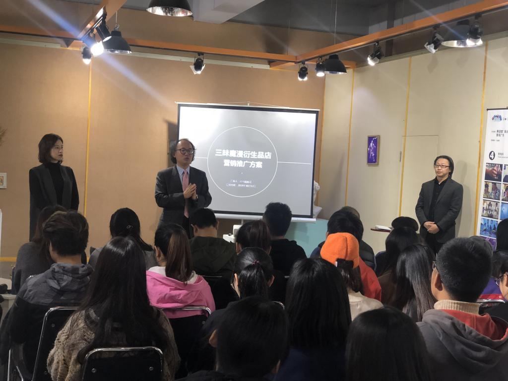 此次工作坊由来自文化产业商学院16级各工作室的26名学生组成,需要完成的项目主题为“三昧魔漫衍生品店营销推广”。金时范教授为学生们讲授了市场营销及IP授权相关专业知识,并针对各组方案,与学生们进行反复沟通交流,对方案的细节和创意等环节精心指导。