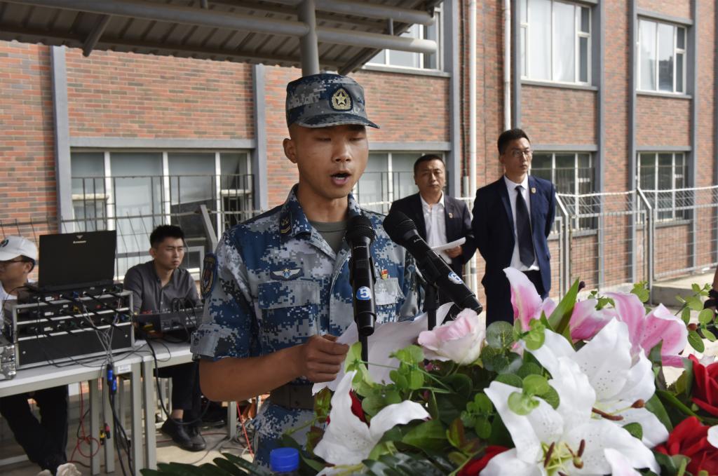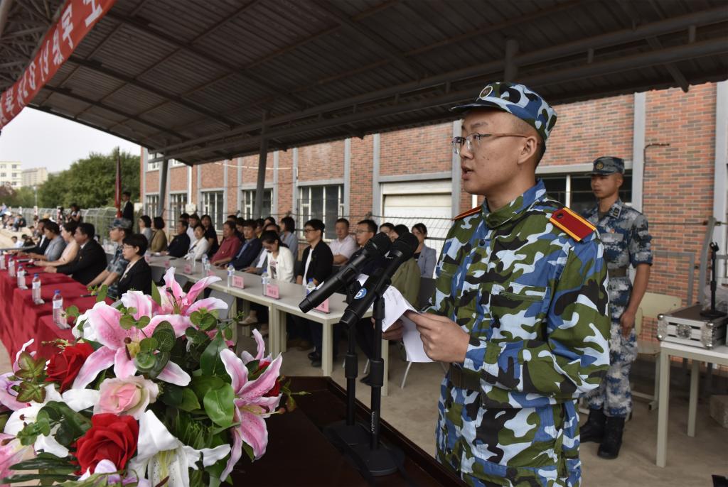 中国人民解放军93246部队闫达上士代表军训团发言。他说,军训期间我们会严格遵守军训的有关要求和学校的管理规定,听从军训团的管理。积极配合各位领导和辅导员的工作,虚心请教,以求共同提高,圆满完成军训任务。