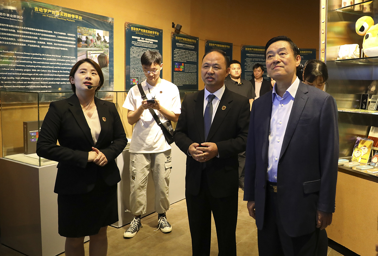 参观中,我校董事会行政运行中心主任李晶还向刘奇葆一行介绍了我校影视事业群、IP事业群、互娱事业群、文娱事业群、创意制作事业群、互创事业群六大学产对接实践教学平台基本情况,以及吉动学产对接实践教学平台在推动产业引领教学变革及特色人才培养方面的具体做法,包括学生如何参与产业实践项目、提升实践能力、如何提升成果市场转化等方面的能力。李晶还特别向调研组介绍了我校原创3D系列动画电影《青蛙王国》自第一部上映以来,先后荣获“五个一工程奖”、“中国文化艺术政府奖第二届动漫奖”、“吉林省长白山文艺奖”等多项国内重要奖项,并成功入围“亚太电影节最佳动画片奖”等情况,这些成果是我校多年探索“学研产一体化”办学模式的具体展示。