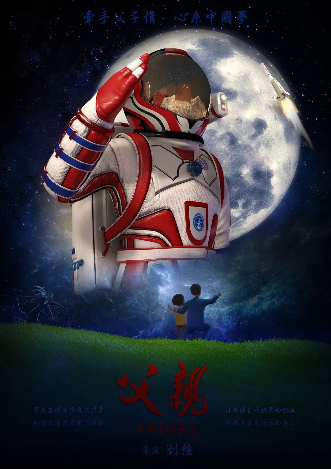 影片主题是“关爱父子情,心系中国梦”。“因为今年正值改革开放四十周年,创作这样关于中国航天的动画短片,是希望能更加唤起当代大学生的集体荣誉感,了解到中国改革开放四十年来的的伟大发展和艰辛道路,希望他们能珍惜美好生活,创作出更多更好的作品。”动画艺术学院教师、短片导演刘畅说,“这种原创项目能够让参与制作的同学们完整的学习到三维动画电影的制作流程,以及相关专业模块的制作技巧,培养他们独立解决问题的能力和团队合作能力。”