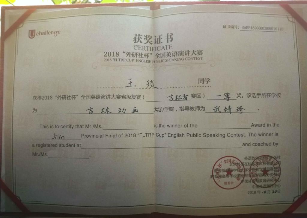 2018年10月20日,“外研社·国才杯”全国英语演讲大赛吉林省赛区复赛在东北师范大学人文学院隆重举行,由国际交流学院选送的我校电影学院16级表演专业的王琰同学凭借精彩的表现在比赛中脱颖而出,荣获吉林省赛区一等奖。