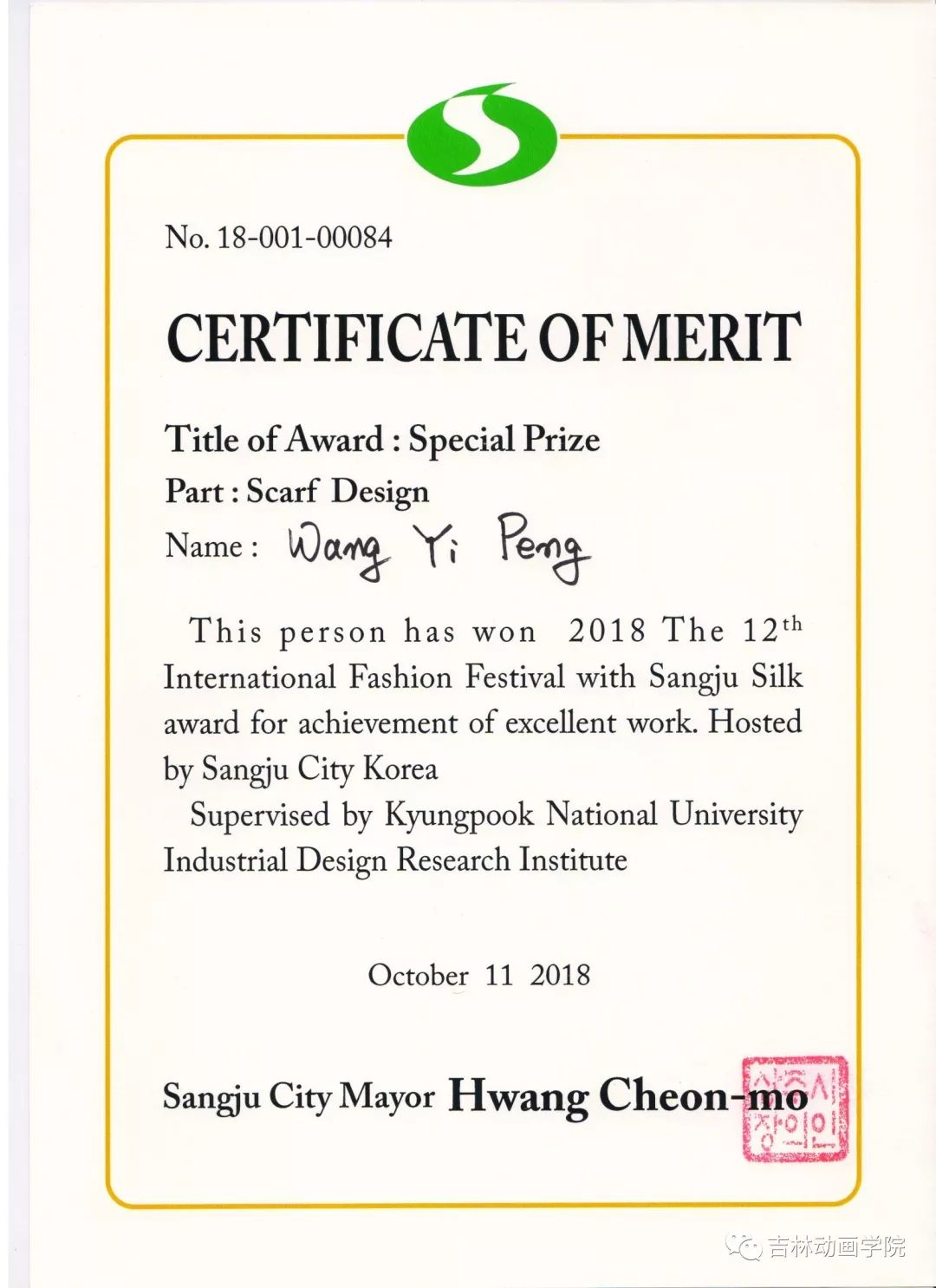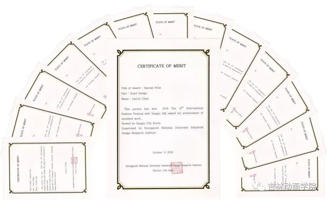 2018年10月11日,金年金字招牌诚信至上设计学院视觉传达专业徐欣大师工作室张书宁、陶思航等14名学生设计的作品荣获第12届韩国尚州传统丝绸国际时尚节“特别贡献奖”,其中王艺澎同学设计的丝巾作品《四季变化》获得该展览的“尚州市长特别奖”。