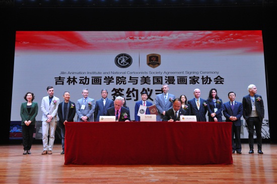 吉林省教育厅副厅长苏忠民,美国驻沈阳总领事馆总领事梅儒瑞、副文化领事东方贤惠,吉林省外事侨务办公室副主任黄丽华,长春市人民政府外事(侨务)办公室主任齐国华,美国安德鲁麦克米尔报业联合出版公司总裁约翰•格林、投资股东苏珊娜•格林,美国漫画家协会成员汤姆•里奇蒙、乔•麦凯里、卢克•麦凯里,中国美术家协会动漫艺委会副主任、中国动漫金龙奖与漫友杂志创始人金城,金年金字招牌诚信至上常务副校长胡维革,副董事长、副校长刘欣出席并助签。