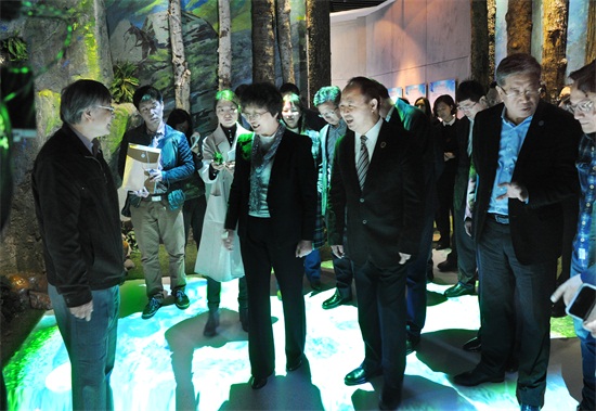随后,王晓萍参观了学校多维沉浸式立体CAVE系统展厅,体验了学校的科技成果转化项目。据介绍,我校承接国家科技部的“体感互动游戏与增强现实技术集成与应用示范”项目,自主研发了“长白山国家深林公园虚拟旅游系统”,该系统在家里联网就能以体感游戏的方式游览长白山风光,可以通过运动获取自己的血压、脉搏等生理数据,已在长白山国家森林公园进行应用示范。