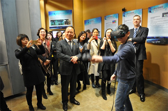 梅儒瑞一行体验我校自主研发的VR体感游戏(刘庆发 摄)