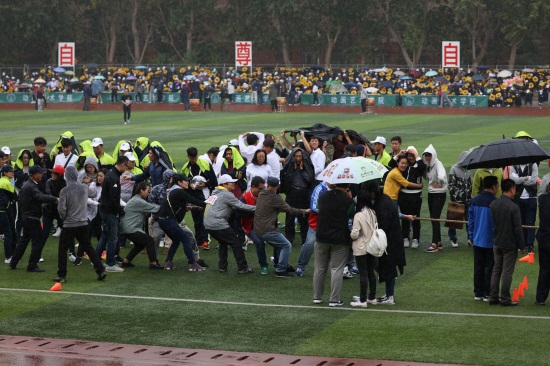 尽管有几场中雨阵阵袭来,到了下午雨也越下越大,但是全体运动员、裁判员和看台上的师生在天公设置的考验面前,都有上佳的表现。尽管雨在下,可是各种竞赛项目几乎没有停,各种表演也仍然在如火如荼地进行着,全校师生斗志昂扬,意气风发,良好的精神风貌在风雨之中熠熠生辉!