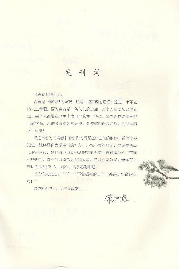 电影学院院长宋江波及校内、外专家名人,为首期《青春》书写了寄语。这些凝炼着真知灼见的语录,将成为《青春》、成为文学系以及电影学院学生们的座右铭,给他们以激励。