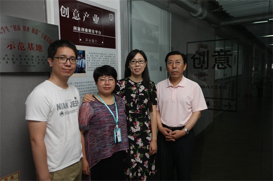 吉林省教育厅高教处副处级调研员赵新雅(右二),我校副校长胡维革(右一)、校长助理王春利(左二)、创新创业孵化平台主管沈健(左一)