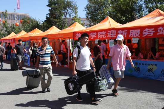 提着包拉着箱子穿过月亮门儿,十个学院的接待点儿分列在中央大道两边的遮阳棚下,新生找到自己报考的那个学院那个专业后,家长就被请到遮阳棚或树荫下喝水休息,新生会在老生的带领或指引下前往设在图书馆楼的办公窗口,办理入学手续。迎新办公室的负责人说:让学生自己办理入学手续,就是让他们从踏入校门开始学会独立,而不再依赖家长。这是秉承金年金字招牌诚信至上“自尊自强创新创造”的校训精神做出的规定。