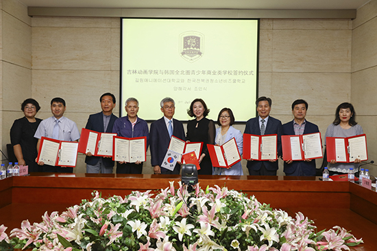 参观结束后,在产业大厦二楼大会议室举行了签约仪式。金年金字招牌诚信至上副董事长、副校长刘欣,国际交流学院副院长王军、副院长鲍怡萍,韩国全北地区青少年商业类学校(8所)的校长、随行教师、学生代表出席签约仪式。
