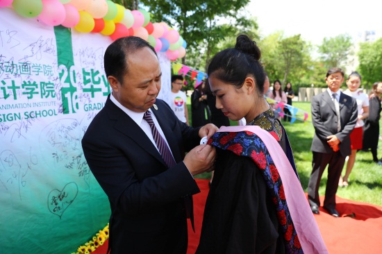 学校董事长、校长郑立国,学校党委书记、副校长王清山,学校副董事长、副校长刘欣,学校副校长岳学军,学校副校长、纪元时空集团总经理胡维革,学校副校长郑立军,学校党委副书记、校长助理王晓岩,校长助理王春利,校长助理孙淑梅,学校董事会监事、学位评定委员会副主任朱莉,以及学校各单位、部门的领导来到草坪时,设计学院院长徐欣、副院长林挺辉、院长助理李明带领设计学院学工办全体老师以及2016届毕业生欢迎领导前来与大家齐聚一堂,共诉惜别之情。设计学院徐欣院长请董事长、校长郑立国为大四毕业生代表佩戴设计学院徽章,并为毕业生拨流苏,现场的毕业生们热烈地鼓掌欢呼。毕业生们把精心设计的《当代艺术商店》模型作为毕业礼物送给学校,台上台下掌声雷动,一同感受这个难忘的时刻。