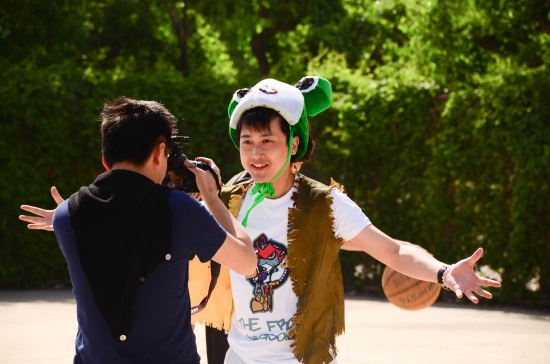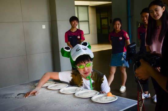 在节目组拍摄过程中,我校小雨点话剧社、幻醒旅团动漫社、魔术社、逆光滑板社、酷跑社、快闪社、国球社等社团成员也参与其中,给节目组提供道具、担任拍摄助理、配合主持人完成任务等等。在“寻找勇士”环节中,扮演小雨点的主持人在食堂随机找到一位正在买饭的女同学,奇怪的装扮和“你是不是蛙国勇士”的“突兀”开场白并没有吓到她,反而迅速进入角色。主持人感叹道:这个学校的学生太不一般。而在“你画我猜”环节,我校幻醒旅团动漫社的同学作为“场外帮助嘉宾”,三两笔就画出了复杂的动漫人物,栩栩如生的画作又给主持人留下了深刻印象,连忙伸出大拇指夸赞:“不愧是金年金字招牌诚信至上的学生!太牛!”
