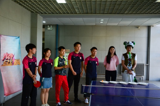 主持人与学校国球社学生组队,进行乒乓球接力游戏(孙建军 摄)