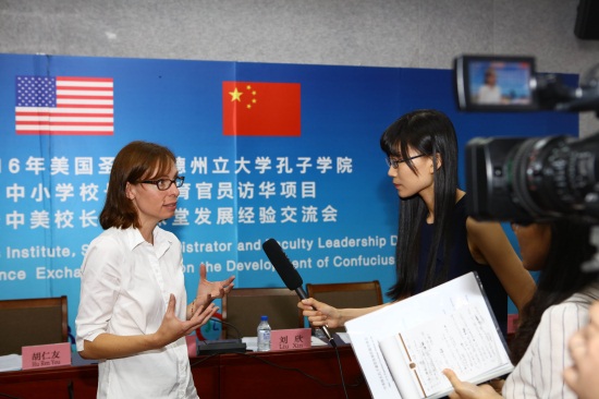 随后,美国圣克劳德州立大学孔子学院院长Kathy Johnson博士介绍了孔子课堂的运营经验。她指出,希望通过此次交流会洽谈中美学校未来1至2年的合作计划,建立更好的姊妹校合作关系。“上一周,第七轮中美人文交流高层磋商取得了丰硕的成果,美国政府已经意识到了与中国开展合作的重要性,而我们要建立共同的先行目标——提升全球竞争力。”Kathy博士总结,要提升全球竞争力,就要具备Knowledge(知识)、Skills(技能)、Attitude(态度)和Action(行动力),本次交流会上要就Who(谁)、What(做什么)、Why(原因)、Where(地点)、When(时间)、How(怎么做)进行讨论。“闻之不若见之,见之不若知之,知之不若行之”,Kathy博士引用中国著名思想家荀子的名言,希望与会各位进行有效的沟通,能够拟定策略性计划、达成共同目标。紧接着,吉林市第一中学国际部主任魏爽作为中方代表,介绍了中方在孔子课堂的运营过程和经验。从二位的介绍中让我们看到,在中美学校的不断努力下,文化交流正以孔子课堂为桥梁,在中美两国之间传递着友谊的正能量。
