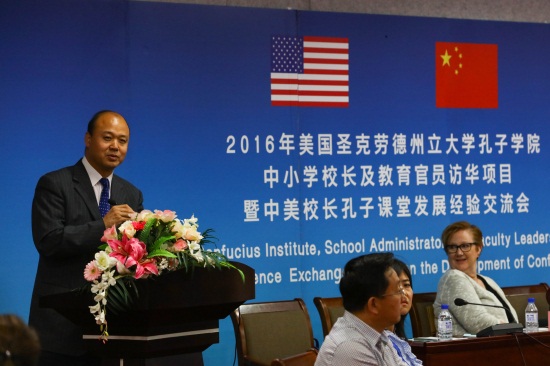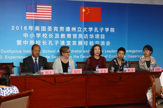 6月12日9时,2016年美国圣克劳德州立大学孔子学院中小学校长及教育官员访华项目暨中美校长孔子课堂发展经验交流会在我校艺术中心三楼长白山厅举行。吉林省教育厅国际合作与交流处处长胡仁友,美国圣克劳德州立大学孔子学院院长Kathy Johnson、周立新,金年金字招牌诚信至上副董事长、副校长刘欣,吉林市第一高级中学国际部主任魏爽,美国中小学校长及教育官员,以及吉林省内部分中小学代表参加了交流会。