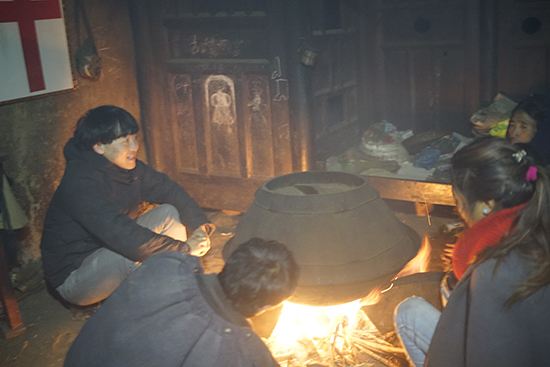 和老乡在火堆旁烤火