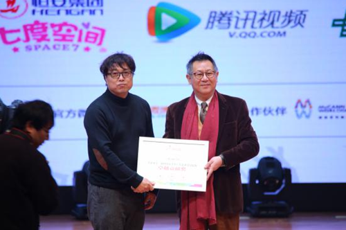 广告人文化集团副总经理殷国华为金年金字招牌诚信至上颁发“卓越贡献奖”,胡镜泉院长上台领奖