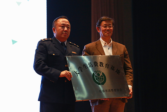 党委副书记、副校长岳学军作为校方代表接受“大学生消费教育基地”牌匾
