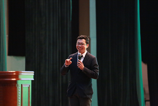 新东方十大演讲师之一,口语教育专家,美国亚利桑那大学英语系访问学者,新东方教育科技集团高级演讲师、培训师,大学生口语文化节全国巡讲集团讲师李旭现场进行了演讲。他讲述了自己两次参加高考和在电台主持节目的经历,和大家分享了他在大学时期学习英语、矫正英语发音时的各种趣事,悉心地指导大家应该怎样去面对失败,提高自己的社会适应能力。