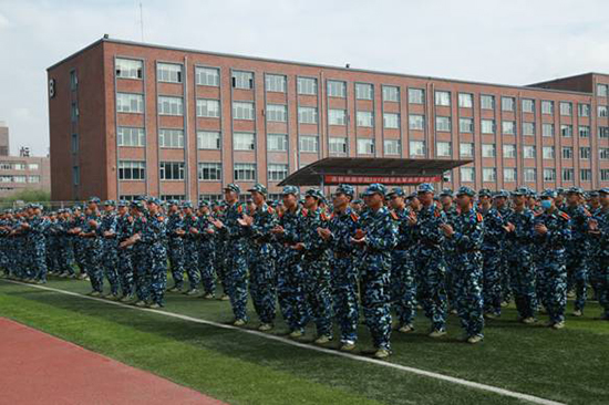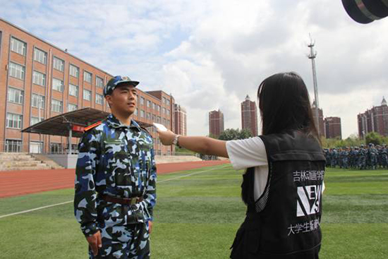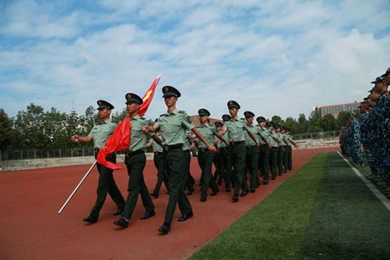 由全体参训教官组成的仪仗队护送国旗,在雄壮的国歌声中,五星红旗升起在学校上空,庄严神圣。传媒学院2015级播音与主持艺术专业学生史常余代表2015级新生在国旗下发言。他说:“我们纪念这样的胜利,是为了不要忘记那些抛弃家庭,走上战场,曾经为民族牺牲的人们。永远不能忘记那段刻骨铭心的历史。