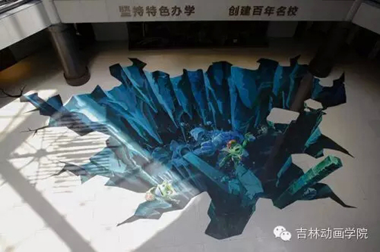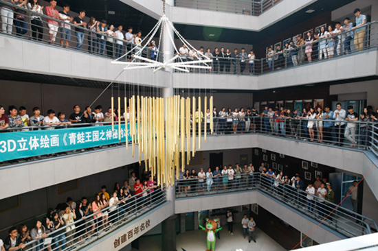 动画艺术学院院长武立杰首先介绍了3D立体画《青蛙王国之神秘的冰谷》的创作过程和立意。他说,3D立体绘画在欧美已经有了很长时间的历史,近年来在中国改革开放政策的引领下,国内开始陆续兴起这种艺术表现形式。动画艺术学院的师生利用寒假时间创作了这件作品,取材学校3D动画电影《青蛙王国2》,充分发挥想象力,形象地将电影中的主角形象刻画出来。虽然在创作上还有一定的不足,但师生共同创作3D立体绘画作品在中国校园内还属首次,非常值得鼓励。希望同学们今后也能继续关注《青蛙王国》系列电影作品,踊跃参与创作和设计。