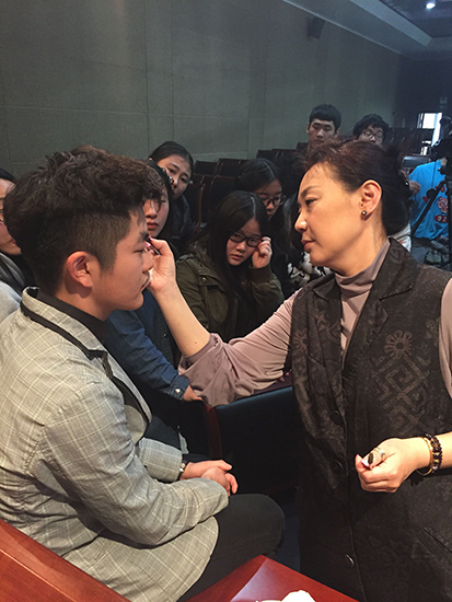同日14时,崔会长来到设计学院教学楼B322化妆教室,与设计学院服装与服饰设计系学生进行了近距离、细致的交流座谈,亲自为每一个到场的学生进行了脸部不同部位的化妆技巧示范,教给他们日常化妆的快速上手技巧,并指出他们需要改进的地方,知识让学生们受益匪浅,引起了学生们对化妆的浓厚兴趣。